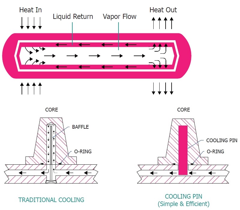 Tabung tembaga disegel dan udara dievakuasi,menciptakan ruang hampa.Saat panas diterapkan ke salah satu ujung pin pendingin oleh sumber eksternal,fluida kerja internal menghilang sebagai uap.Perbedaan tekanan yang dihasilkan mendorong uap dari ujung yang dipanaskan ke daerah yang lebih dingin di mana ia mengembun dan melepaskan semua energi panas dengan tingkat keseragaman termal yang tinggi..